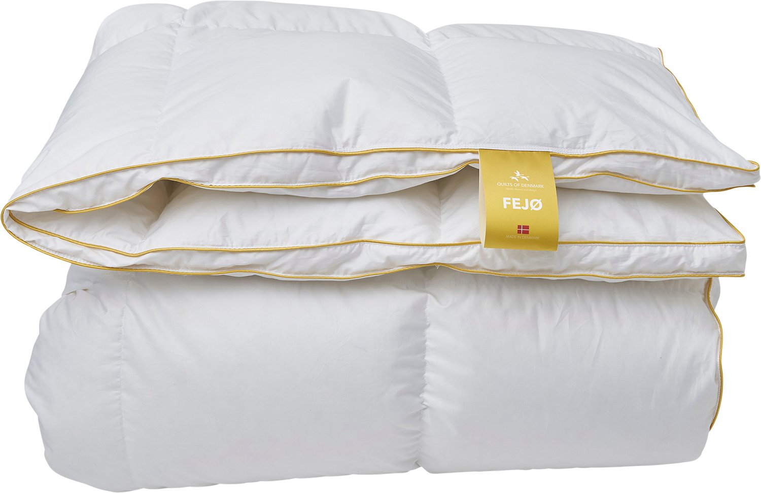 Quilts of Denmark® hylder FEJØ med en eksklusiv dyne- og pudeserie, der er fremstillet det fineste satin vævede bomuld med fyld af moskus dun den høje kvalitet er understreget med en gylden piping/kant. Sortimentet omfatter såvel en luksuspude, samt helår